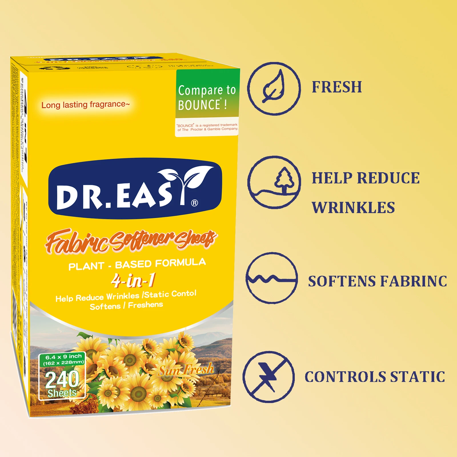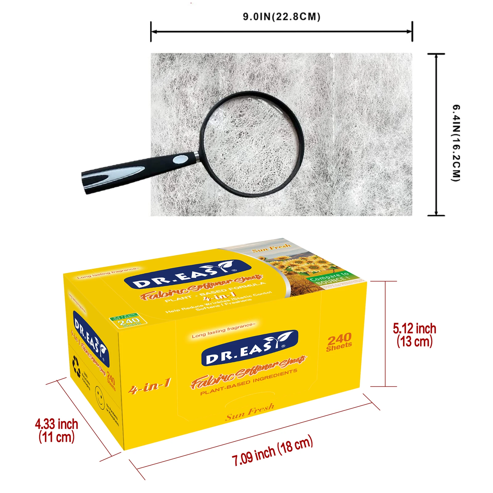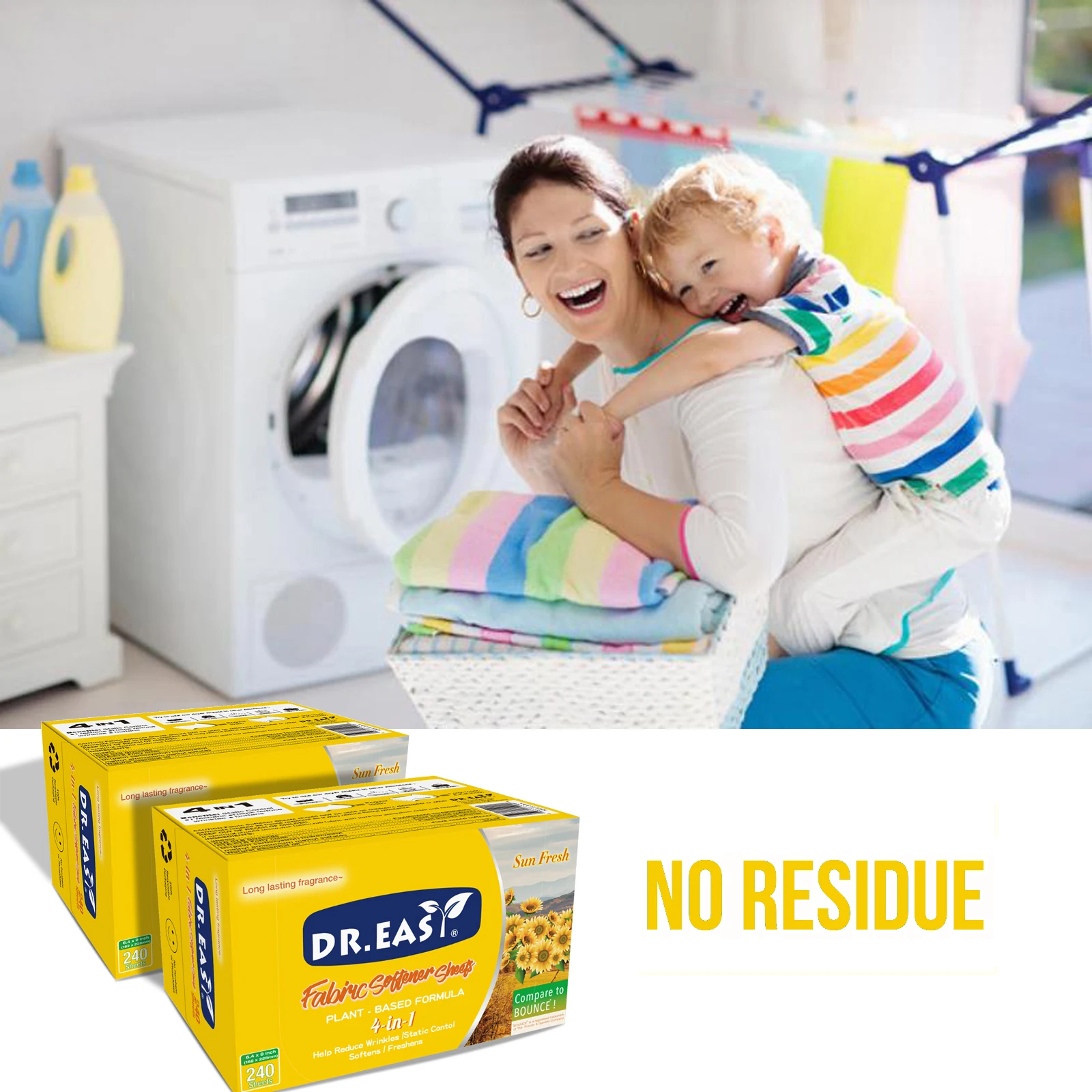 Dr.Easy dryer sheets are carefully crafted Climate Pledge Friendly using compact box,formula derived from palm oil,spun-bond nonwoven substrate. Just toss in your dryer to soften fabrics, reduce wrinkles, reduce static cling and even help repel pet hair, while leaving your clothes feeling soft,smelling cozy and clean.