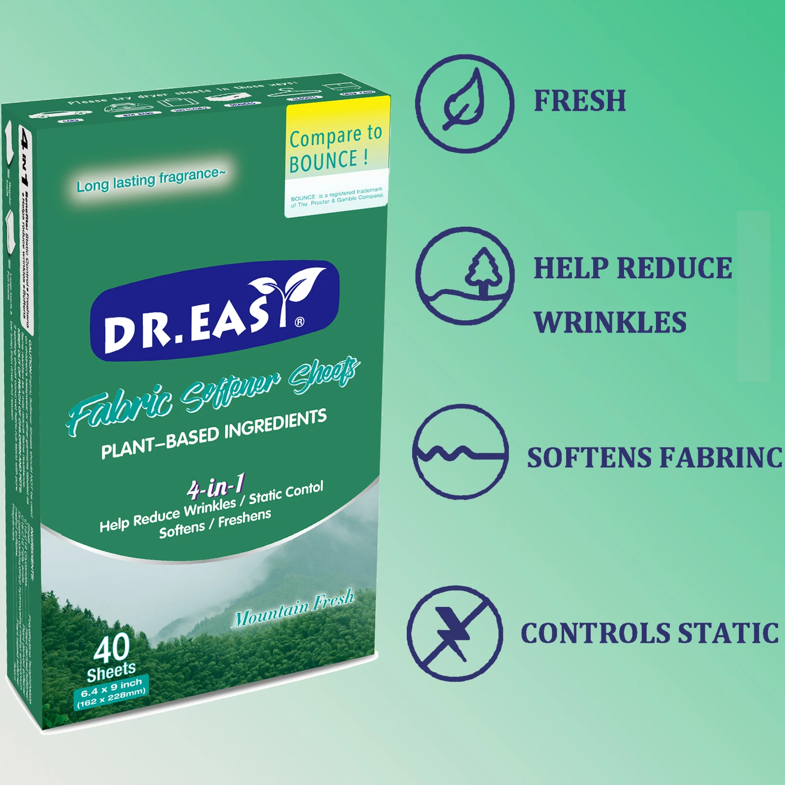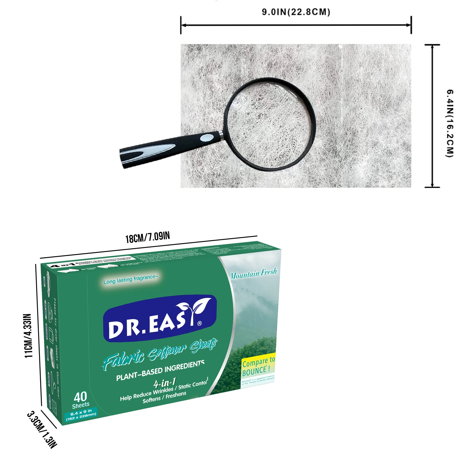 Dr.Easy dryer sheets are carefully crafted Climate Pledge Friendly using compact box,formula derived from palm oil,spun-bond nonwoven substrate. Just toss in your dryer to soften fabrics, reduce wrinkles, reduce static cling and even help repel pet hair, while leaving your clothes feeling soft,smelling cozy and clean.