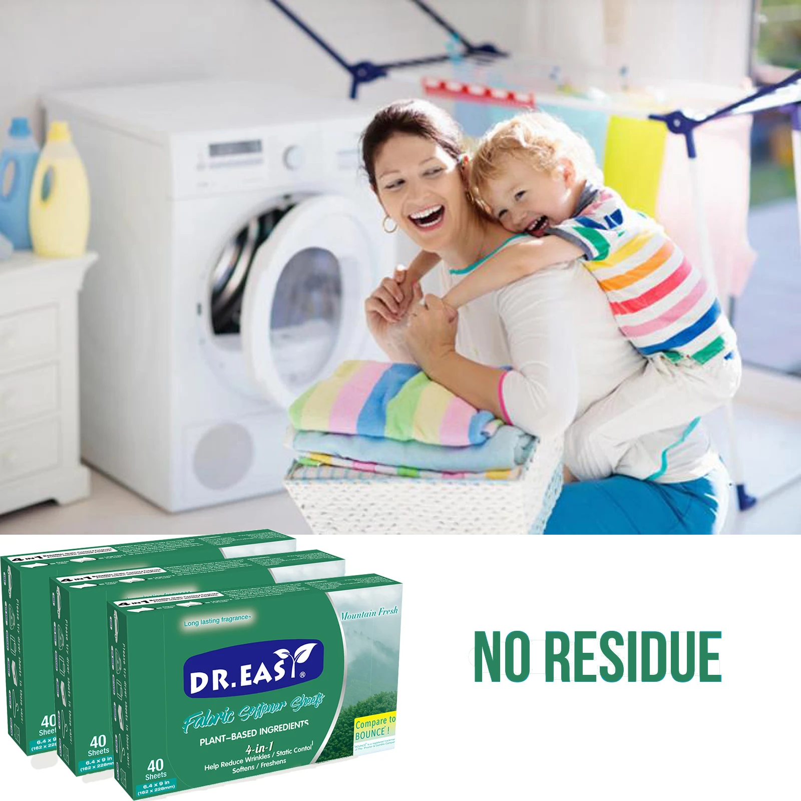 Dr.Easy dryer sheets are plant-based formulated by high-quality ingredients that are proudly cruelty-free & vegan, never tested on animals, with 0% dyes, 0% fragrances,0% phosphates,0% parabens, 0% bleach or 0% brighteners. Hypoallergenic formula made for sensitive skin and safe around kids, pets, and the planet.
