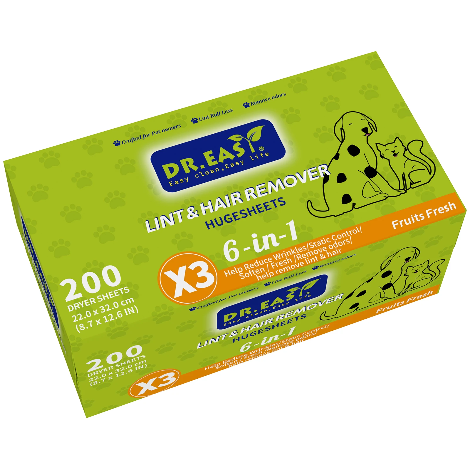Dr.Easy dryer sheets are carefully crafted Climate Pledge Friendly using compact box,formula derived from palm oil,spun-bond non-woven substrate. Just toss in your dryer to soften fabrics, reduce wrinkles, reduce static cling and even help repel pet hair, while leaving your clothes feeling soft,smelling cozy and clean.
