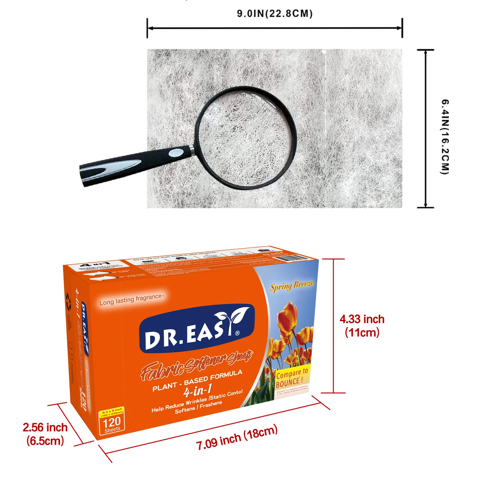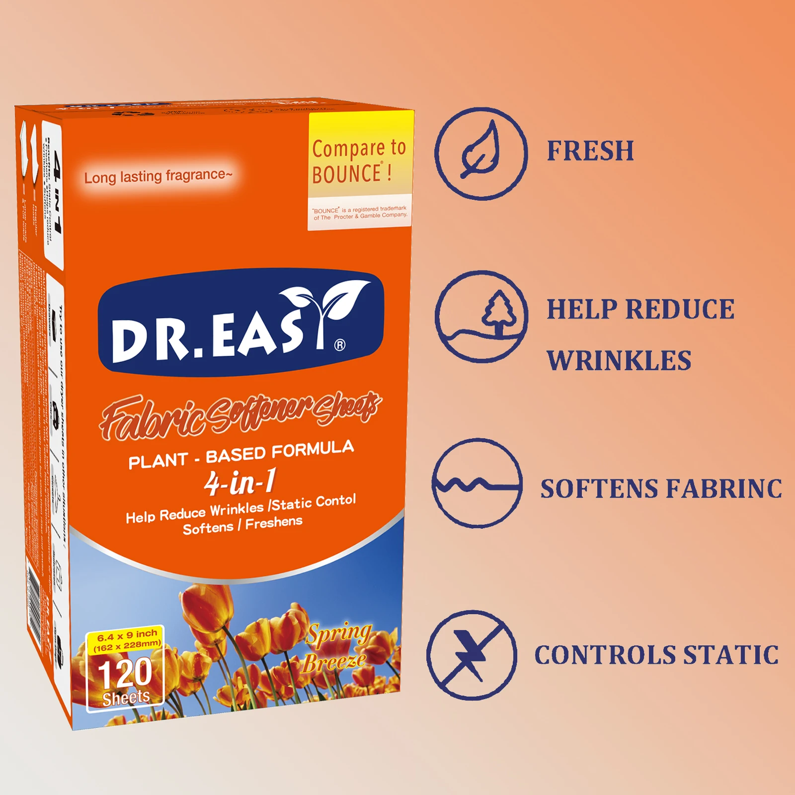 Dr.Easy dryer sheets are carefully crafted Climate Pledge Friendly using compact box,formula derived from palm oil,spun-bond nonwoven substrate. Just toss in your dryer to soften fabrics, reduce wrinkles, reduce static cling and even help repel pet hair, while leaving your clothes feeling soft,smelling cozy and clean.