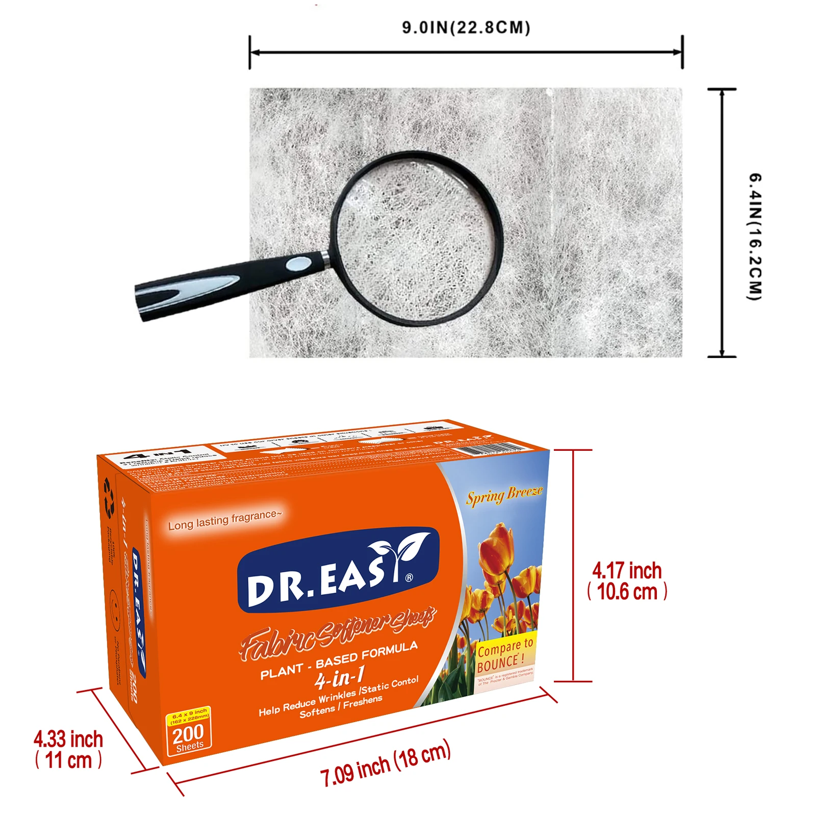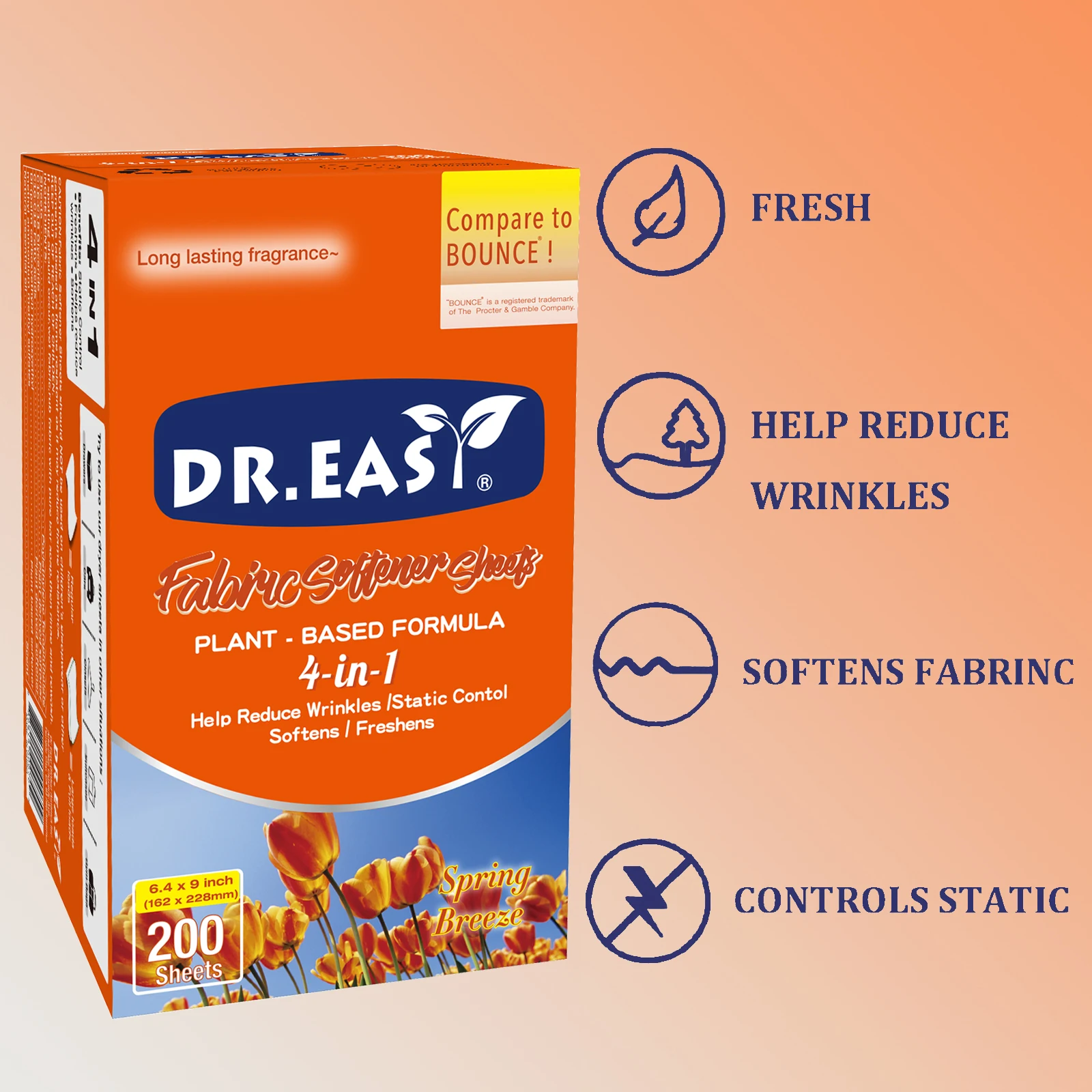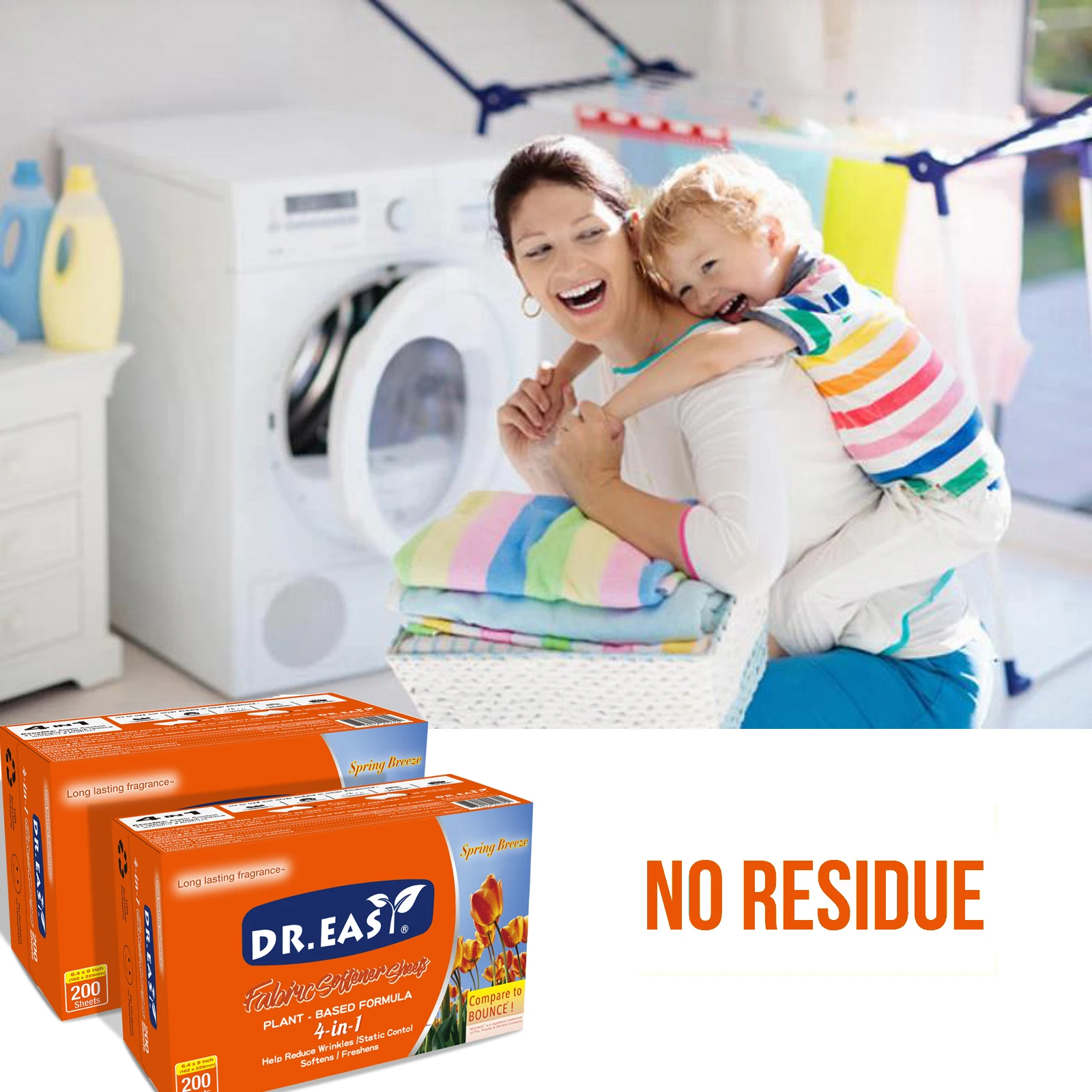 Dr.Easy dryer sheets are carefully crafted Climate Pledge Friendly using compact box,formula derived from palm oil,spun-bond nonwoven substrate. Just toss in your dryer to soften fabrics, reduce wrinkles, reduce static cling and even help repel pet hair, while leaving your clothes feeling soft,smelling cozy and clean.