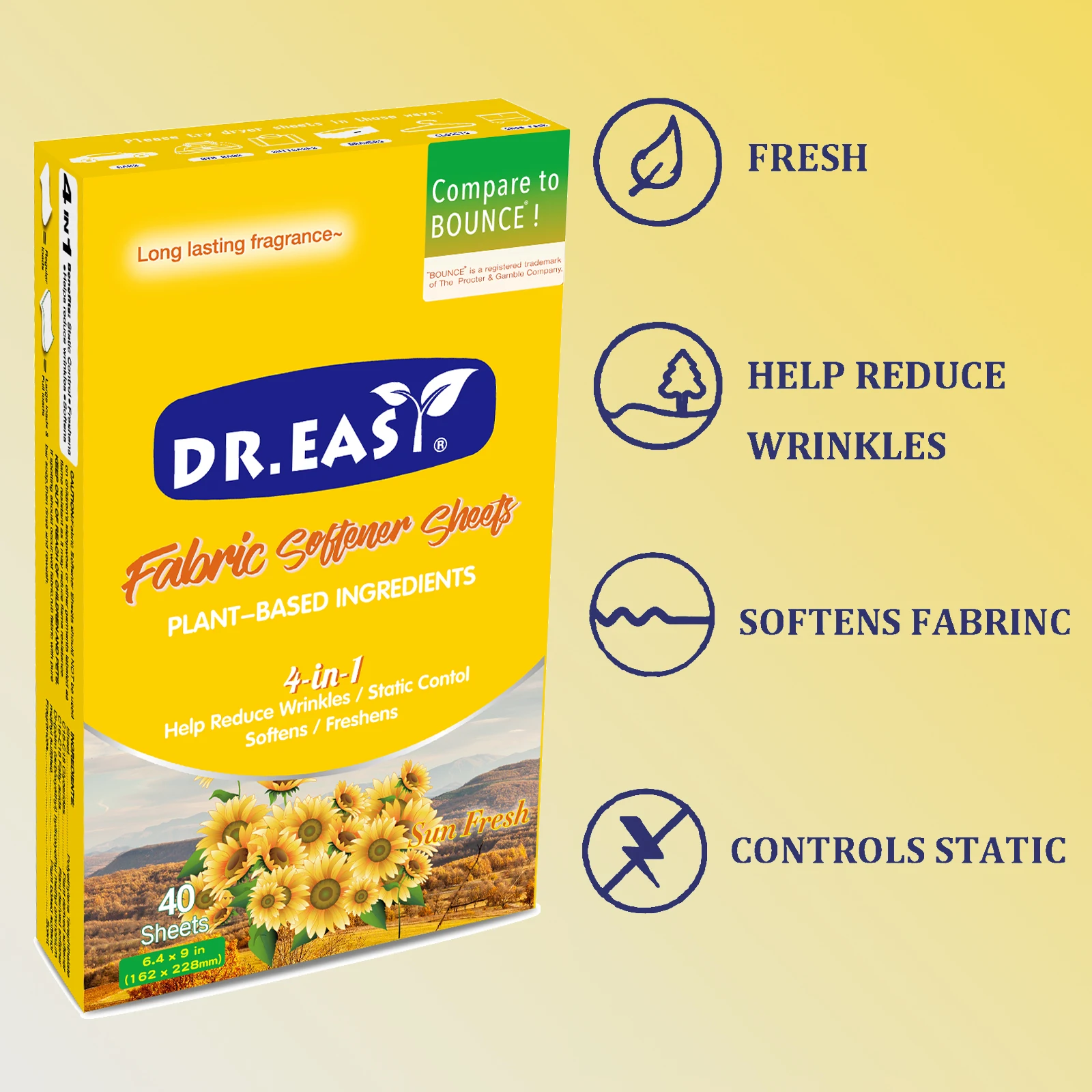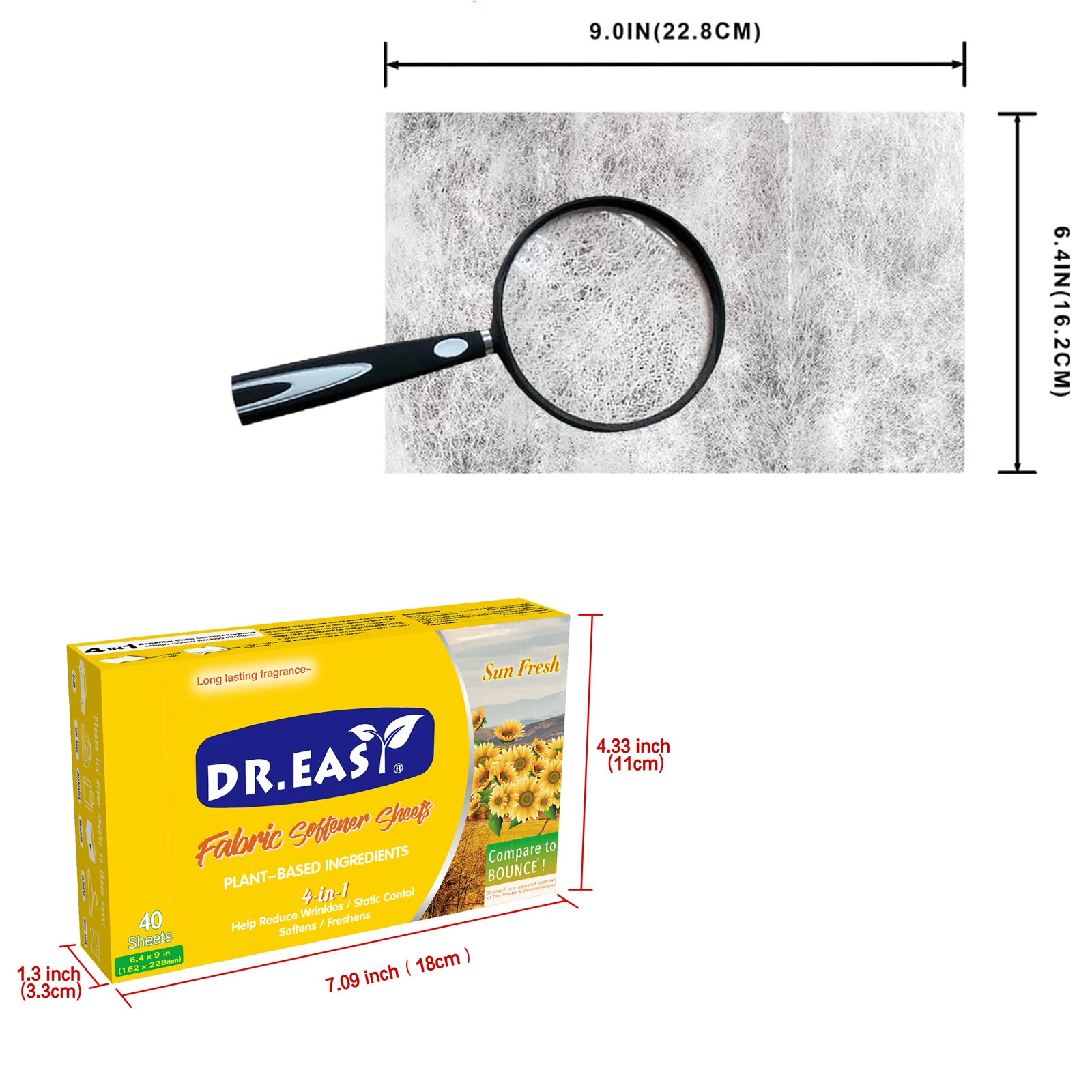 Dr.Easy dryer sheets are carefully crafted Climate Pledge Friendly using compact box,formula derived from palm oil,spun-bond nonwoven substrate. Just toss in your dryer to soften fabrics, reduce wrinkles, reduce static cling and even help repel pet hair, while leaving your clothes feeling soft,smelling cozy and clean.