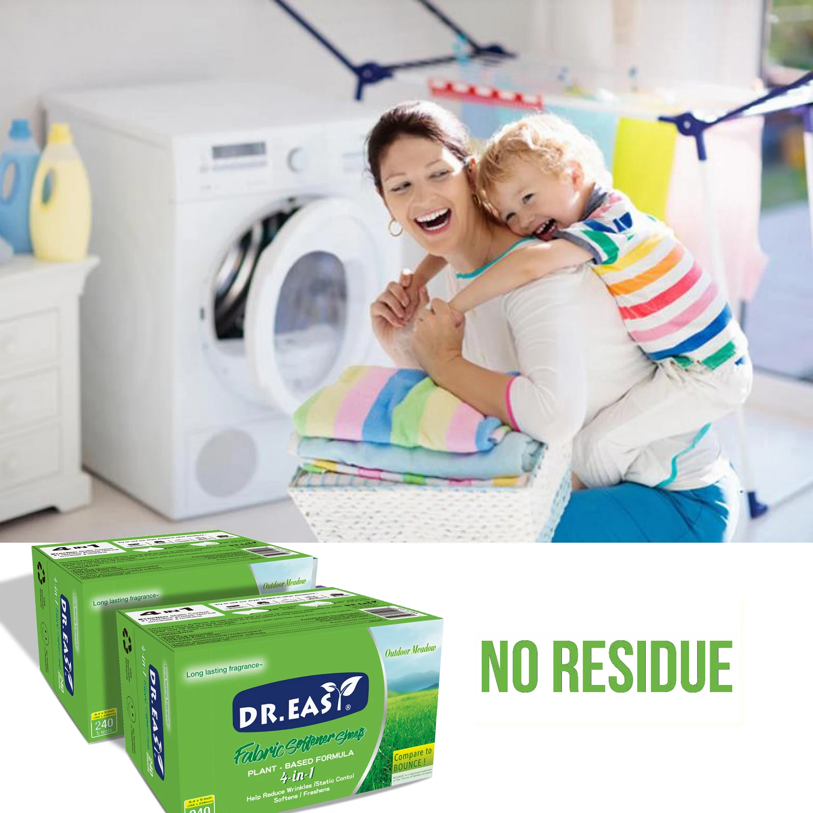 Dr.Easy dryer sheets are plant-based formulated by high-quality ingredients that are proudly cruelty-free & vegan, never tested on animals, with 0% dyes, 0% fragrances,0% phosphates,0% parabens, 0% bleach or 0% brighteners. Hypoallergenic formula made for sensitive skin and safe around kids, pets, and the planet.