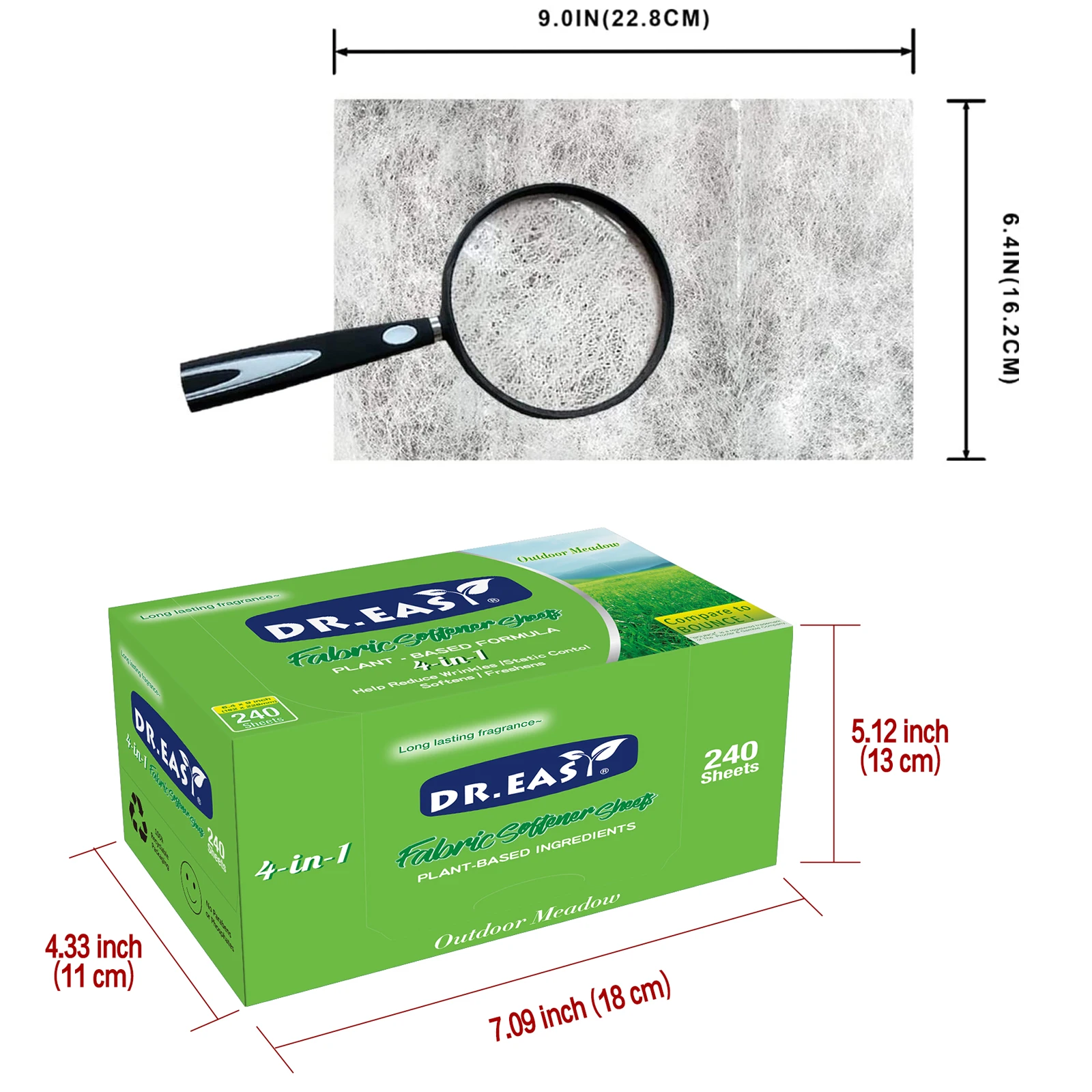 Dr.Easy dryer sheets are carefully crafted Climate Pledge Friendly using compact box,formula derived from palm oil,spun-bond nonwoven substrate. Just toss in your dryer to soften fabrics, reduce wrinkles, reduce static cling and even help repel pet hair, while leaving your clothes feeling soft,smelling cozy and clean.